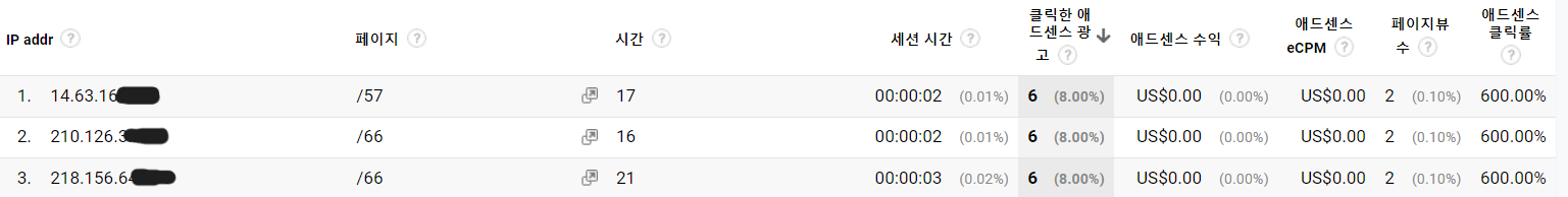 2초, 3초 남짓한 시간을 머무르면서 광고를 6번씩이나 클릭하는 것은 누가봐도 고의적으로 보이죠.